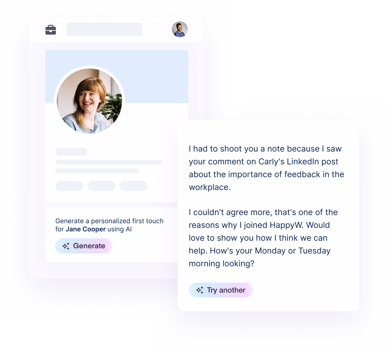 Forget about time-consuming message generation. Harness the power of AI to hyper-personalize your outreach at scale.
