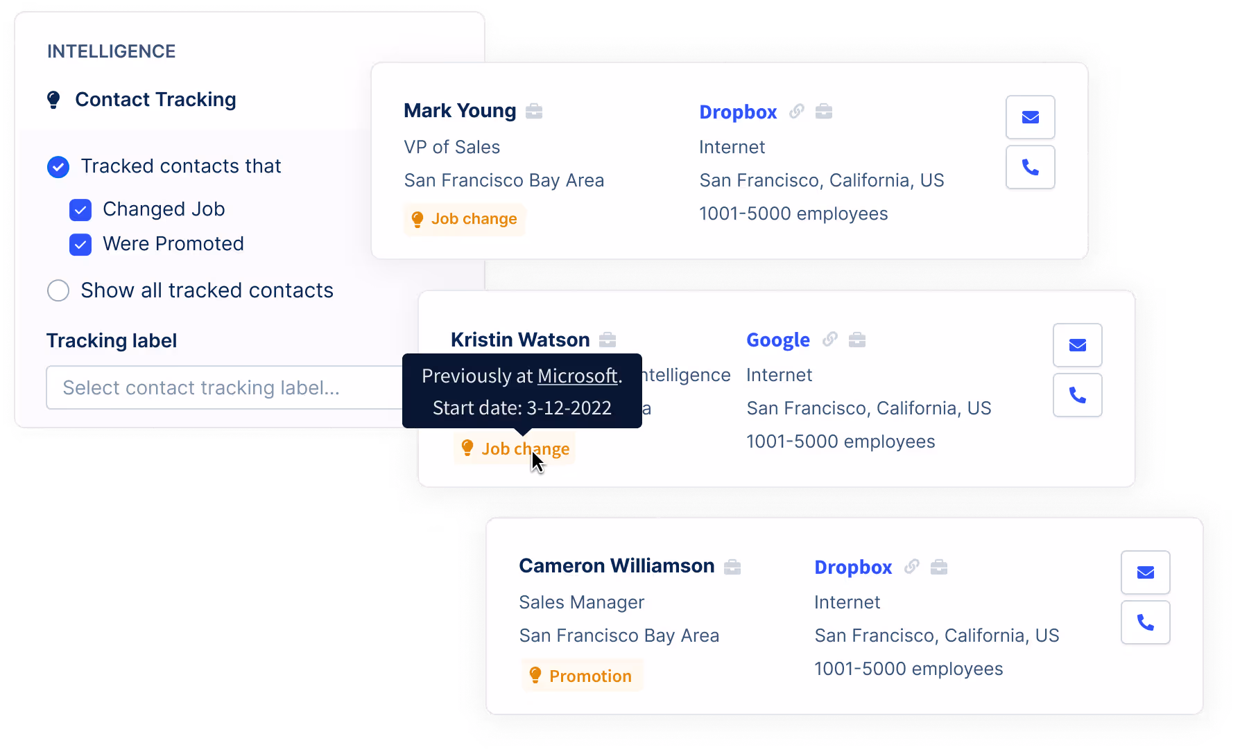 Job Change Alerts are a form of automated lead-monitoring that keep you connected with your key prospects, customers, and advocates by identifying and notifying you of their career moves. These alerts help you to anticipate their future needs so you can be the first to reach out when a potential sales opportunity arises.